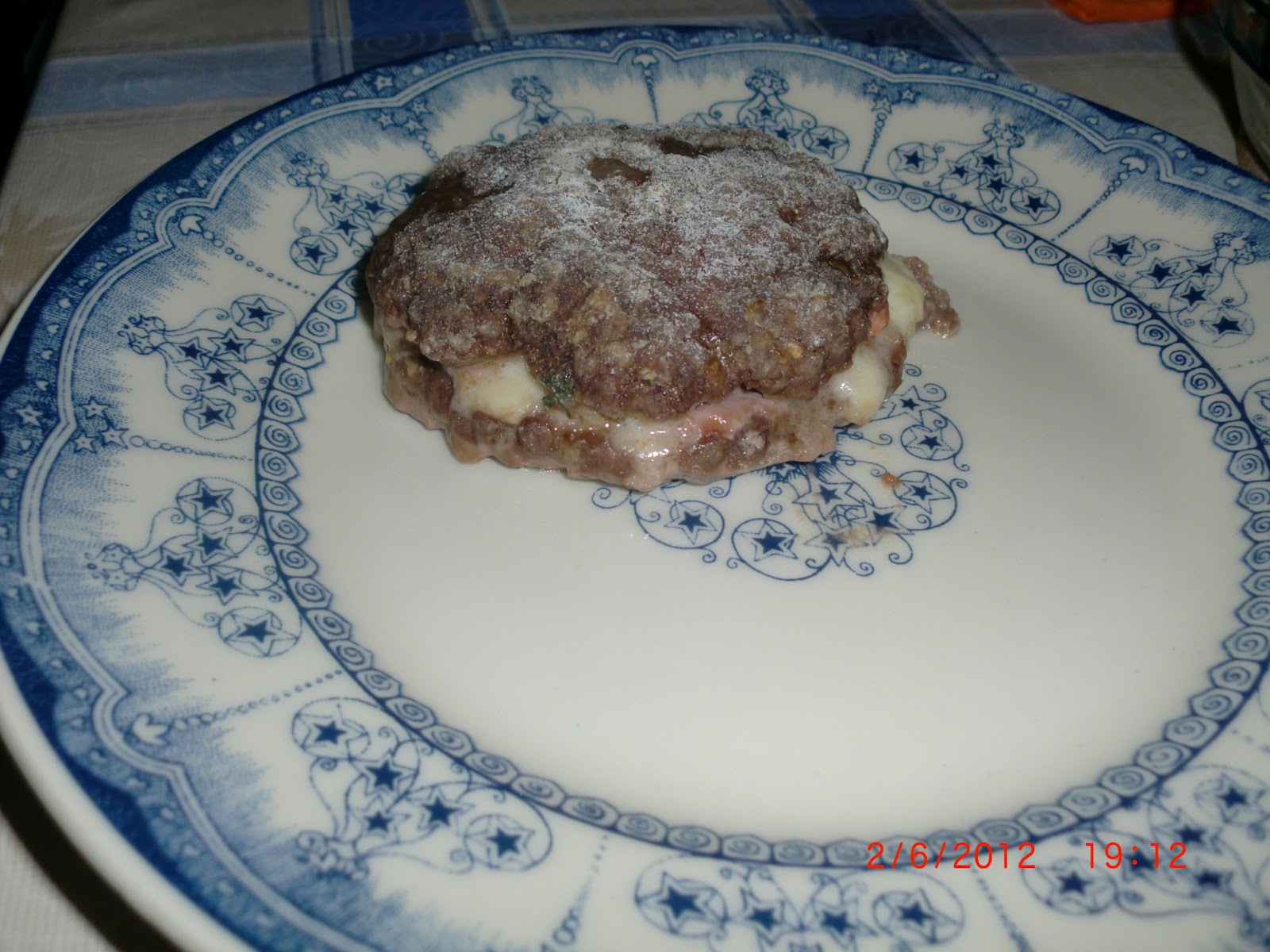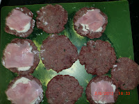 Depois espalmei a carne na mão ou na bancada e coloquei um pouco da mozarella fresca, fiambre (ou presunto, ou o que tivermos no frigorífico) e cobri com outra porção de carne espalmada.