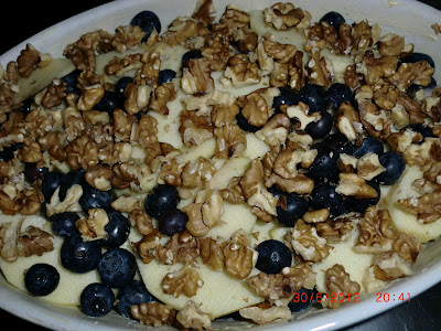 Untei uma travessa de ir ao forno com margarina, cortei as maçãs em fatias, alternei com mirtilos, nozes ou amêndoas, polvilhei com canela em pó e coloquei por cima a massa areada.