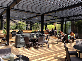 Seguindo para a parte exterior, que tanto me falaram, onde ficava o bar e o restaurante, ficámos boquiabertos com tamanha beleza! Lá estava um deck, semi fechado, mas com tecto transparente, mesmo ideal para este clima instável, uma decoração muito bem conseguida, cheia de natureza, alegre, luminosa, com muito requinte e glamour, mas ao mesmo tempo com um ar descontraído, e que convida mesmo a relaxar e ao mesmo tempo conviver com os amigos! Muito romântico, com uma música harmoniosa, ali vimos chover e fazer sol! Deliciando-nos com uns cafés e um refresco de chá verde e erva príncipe e um belo pedaço de ananás! Ficava ali o resto do dia...! Uma tv enorme, um sofá super confortável e mesmo no exterior com uma óptima cobertura de internet.